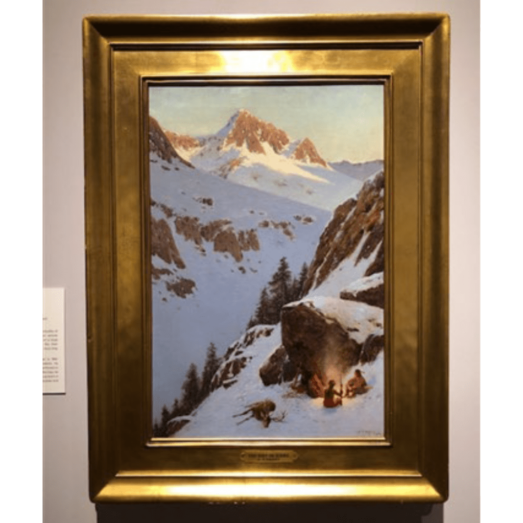 In this wintry, camp scene, Farny uses the verticality of the canvas to emphasize the steep and remote mountain landscape. Nestled in the shelter of a large rock, three lone hunters keep warm by a fire, their snowshoes and guns resting nearby the large buck they shot—the blood still fresh from its mouth. Farny first traveled to the American West in 1881, spending time near present day North Dakota. He returned West again in 1883 and 1884 and continued to regularly visit until his last trip in 1894. During his trips, he gathered visual references and artifacts to use back in his Cincinnati studio, in order to recreate the scenes and events he witnessed.